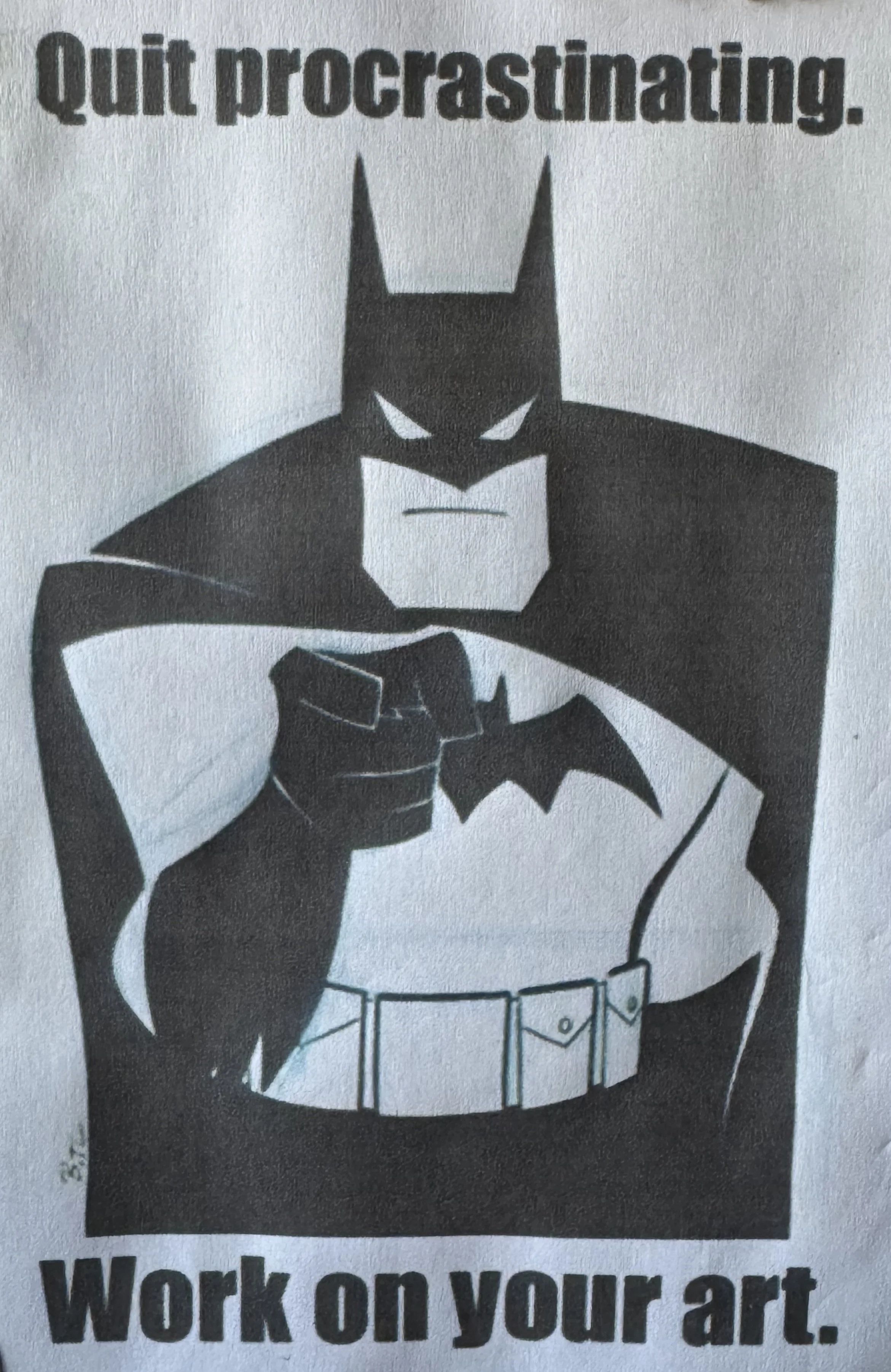 Lastly, a sentimental piece that I hang anytime I move to a new workspace: my motivational 90s cartoon Batman image. It was a joke meme I found online when I was in college working on my fine arts degree. It's literally a picture of Batman from the 90s animated TV show leaning forward and pointing with the words "Quit procrastinating. Work on your art.” It was meant to reference the iconic Uncle Sam recruitment poster. I loved it so much I printed it out on my basic desktop printer and pinned it to my bulletin board to "keep me in check” while I worked toward my BFA. I've never gotten rid of it and never plan to.