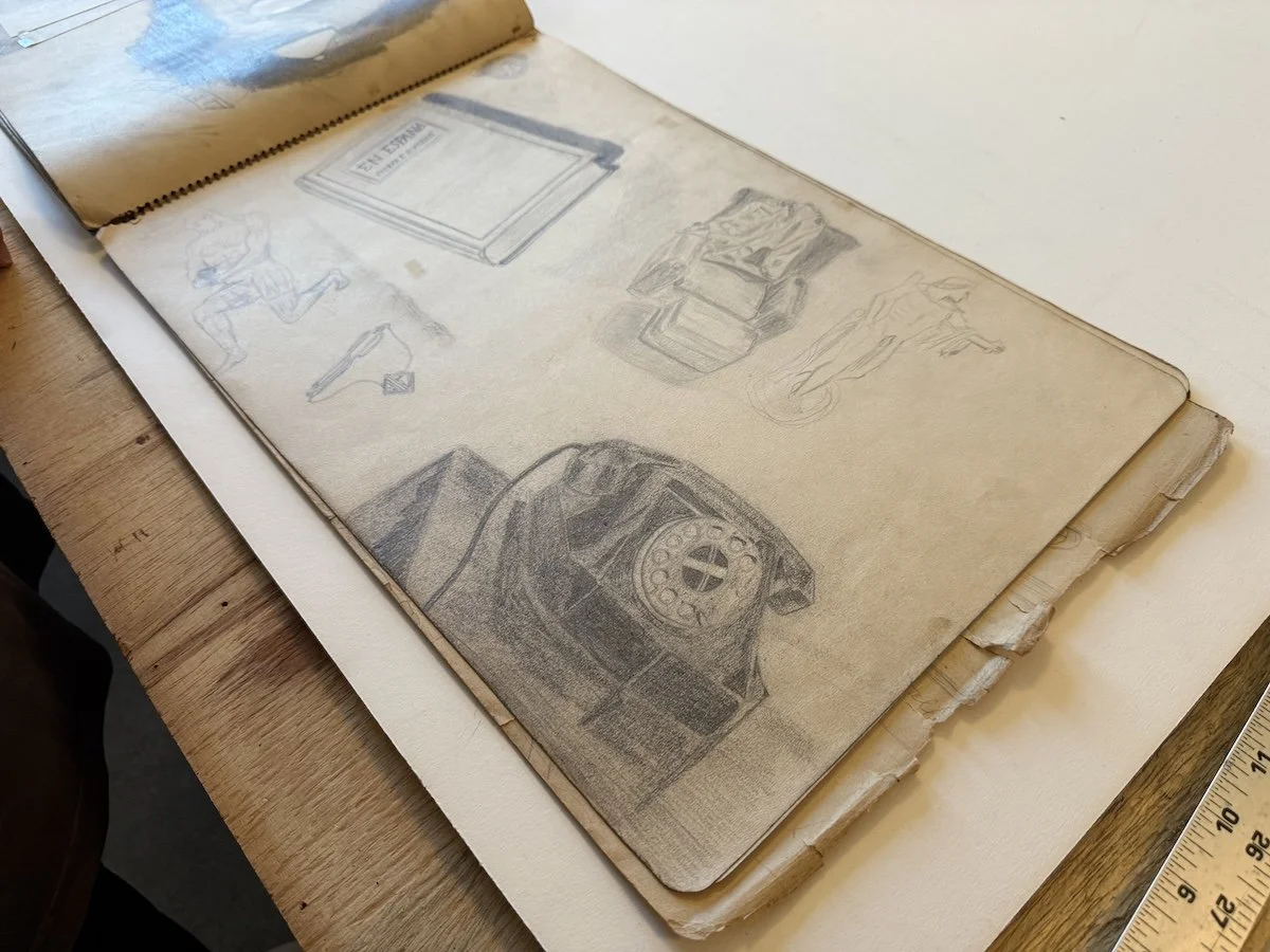BROWNVILLE - Every time Clarissa Weitzel digs into the flat files of artist Bill Farmer at The Antiquarium in Brownville, Neb., she finds a new treasure. She recently unearthed one of Farmer’s first sketchbooks, which dates back to 1947 (pictured below). Some of its pages contain actual grades from one of Farmer’s art teachers or professors.